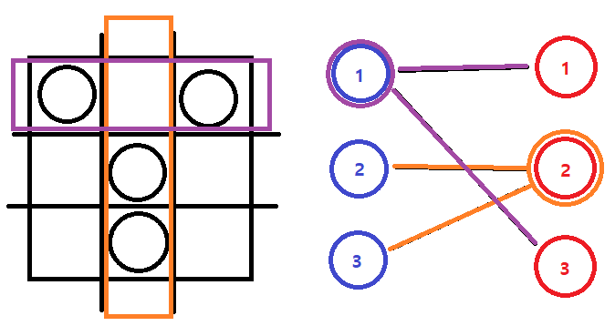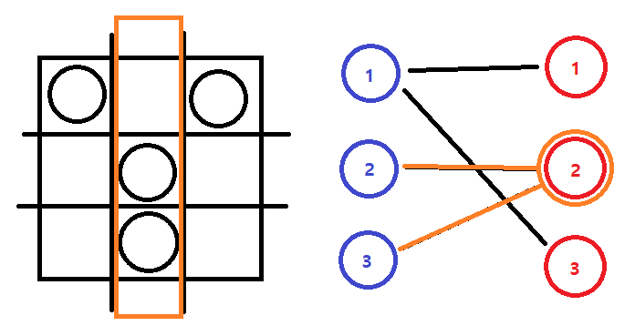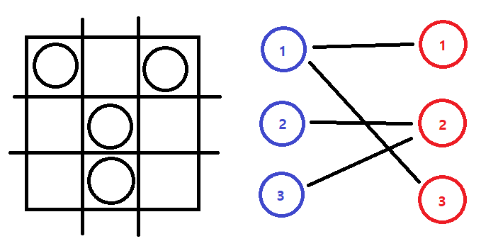 행과 열을 나누어 각각 노드 그룹으로 쪼갠 뒤 돌이 있는 위치의 행 노드와 열 노드를 연결해 그래프를 만든다면 각 간선의 양 끝중 하나의 정점만 선택되어도 해당 간선에 해당되는 돌은 선택되었다고 볼 수 있습니다. 왜냐하면 해당 돌의 위치에 해당하는 행이나 열 둘 중 하나만 선택해 돌을 주으며 지나가도 해당하는 돌을 모두 주울 수 있기 때문입니다. 즉 모든 간선이 선택될 수 있는 최소한의 정점의 수를 구한다면 모든 돌을 선택할 수 있는 최소의 행과 열 개수를 구할 수 있다는 말입니다.