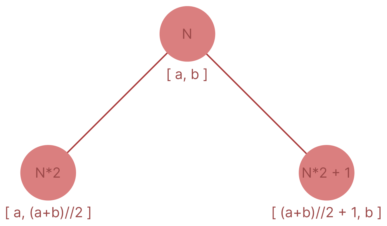 또한 세그먼트 트리의 루트 노드는 1 로 설정하는 편이 편합니다. 그러는 편이 부모 노드에 2 를 곱하면 왼쪽 자식 노드, 2 를 곱한 뒤 1 을 더하면 오른쪽 자식 노드를 탐색하게 되어 탐색이 편하기 때문입니다.