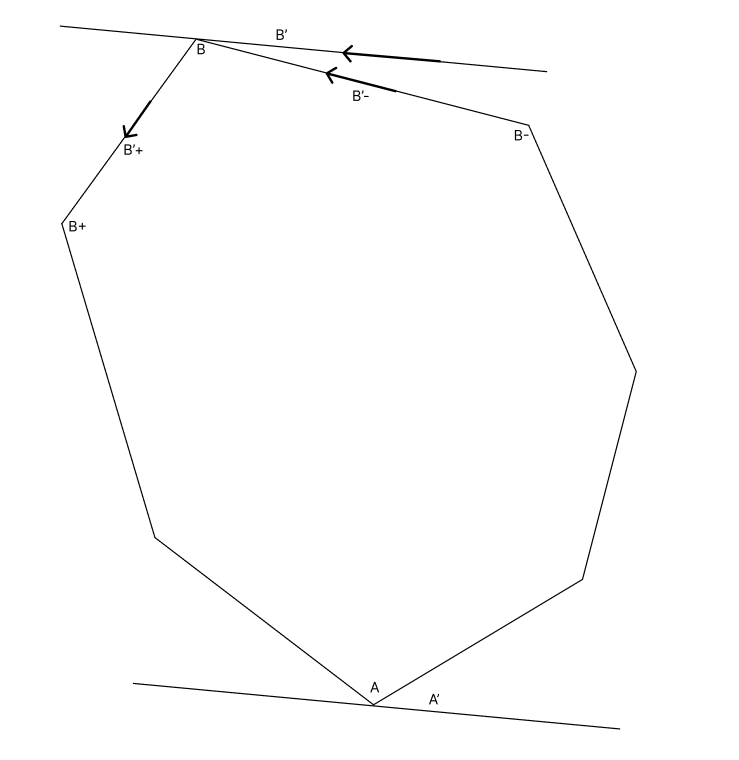 https://www.acmicpc.net/problem/10254지난번에 포스팅한 문제와 같은 알고리즘을 사용하지만 이번에는 단순 계산으로는 시간초과가 발생하므로 회전하는 캘리퍼스 알고리즘으로 문제를 풀었습니다. 회전하는 캘리퍼스는 특정한 도형에서 가장 먼 두 꼭지점을 찾는데 아주 유용한 알고리즘입니다.어떠한 점 A 에서 가장 먼 점 B 를 구할 때 점 A 를 지나는 직선 A' 를 정하면 그 직선과 평행하고 점 B 를 지나는 직선 B' 는 항상 존재합니다. 또한 직전의 점 B- 와 점 B 를 잇는 벡터 B'- 와 점 B 와 직후의 점 B+ 를 잇는 벡터 B'+ 는 각각 B' 와 이루는 외적값의 부호가 반대입니다.즉 (B-, B) : B'- / B' 와 B' / (B, B+) : B'+ 가 이루는 외적값..